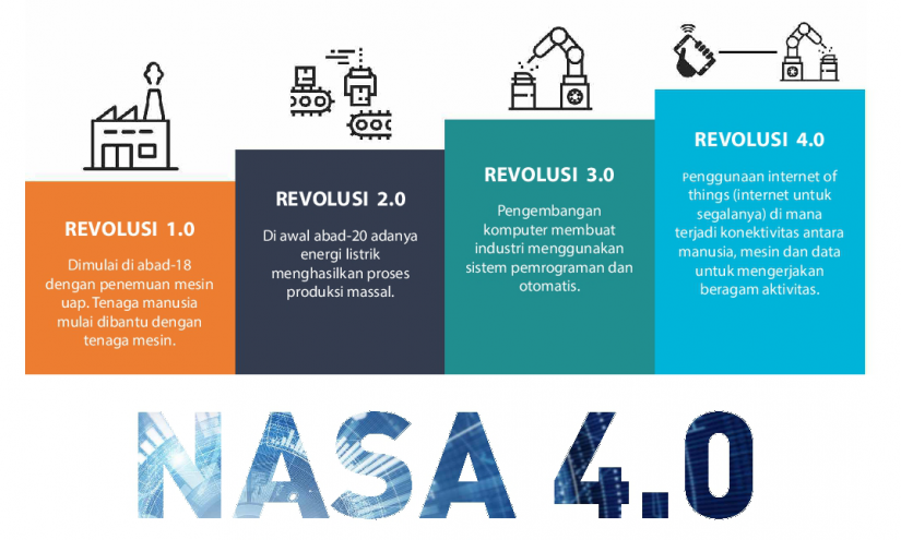 Memasuki perkembangan era 4.0 , diperlukan 4 tahapan bagi Kita semua untuk bisa mensinkronkannya. Pertama, tentu Kita harus benar-benar menyadari terlebih dahulu bahwa zaman telah berubah memasuki fase yang baru yaitu fase 4.0 dengan segala konsekuensinya yang sulit untuk dihindari, sehingga dengan timbulnya kesadaran tersebut akan menghasilkan kemauan kuat untuk berubah menyesuaikannya. Kedua, secara umum Kita berusaha untuk mempelajari terkait perkembangan dan perubahan apa saja yang telah dan akan terjadi akibat gelombang teknologi 4.0 yang semestinya akan semakin menambah tekad Kita untuk berubah. Ketiga, secara khusus mempelajari hal-hal apa yang bisa diterapkan sesuai dengan bidang /aktivitas kerja kita, dalam hal ini PT.NASA telah berupaya membantu menyiapkannya seperti beberapa point di atas. Dan keempat tentu Kita bertahap berusaha untuk menerapkan/mempraktekan prinsip-prinsip 4.0 dalam aktivitas kerja Kita.