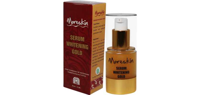 Moreskin Serum Whitening Gold, diperkaya dengan niacinamide, licorice root extract dan alpha arbutin yang dapat membantu mencerahkan kulit, melembabkan kulit serta menyamarkan garis halus