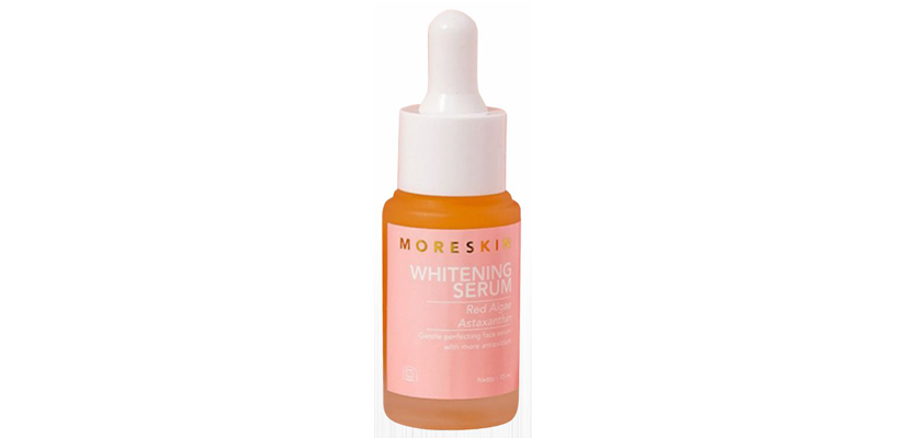 MORESKIN Whitening Serum dengan kandungan Niacinamide, Vitamin C dan Vitamin E yang berfungsi untuk membantu menangkal radikal bebas serta dengan kandungan Red Algae (Kappaphycus Alvarezii Extract) dan Astaxanthin sebagai Antioksidan yang dapat membantu mencerahkan serta melembabkan wajah